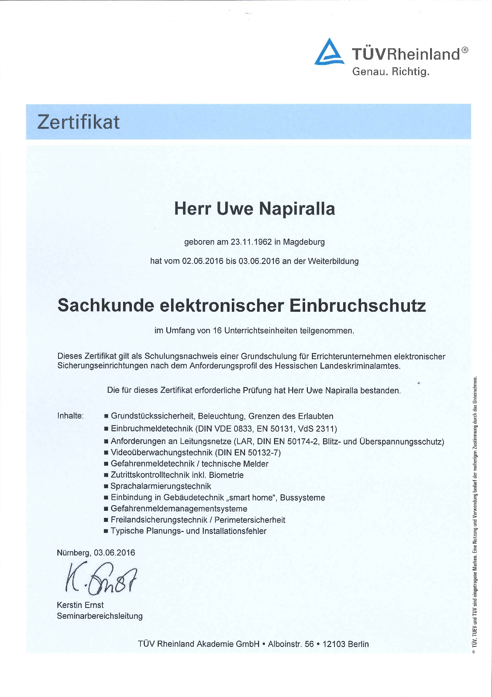 Hr. Uwe Napiralla verfügt seit dem Jahr 2016 über die Zusatzqualifikation "Sachkunde elektronischer Einbruchschutz"