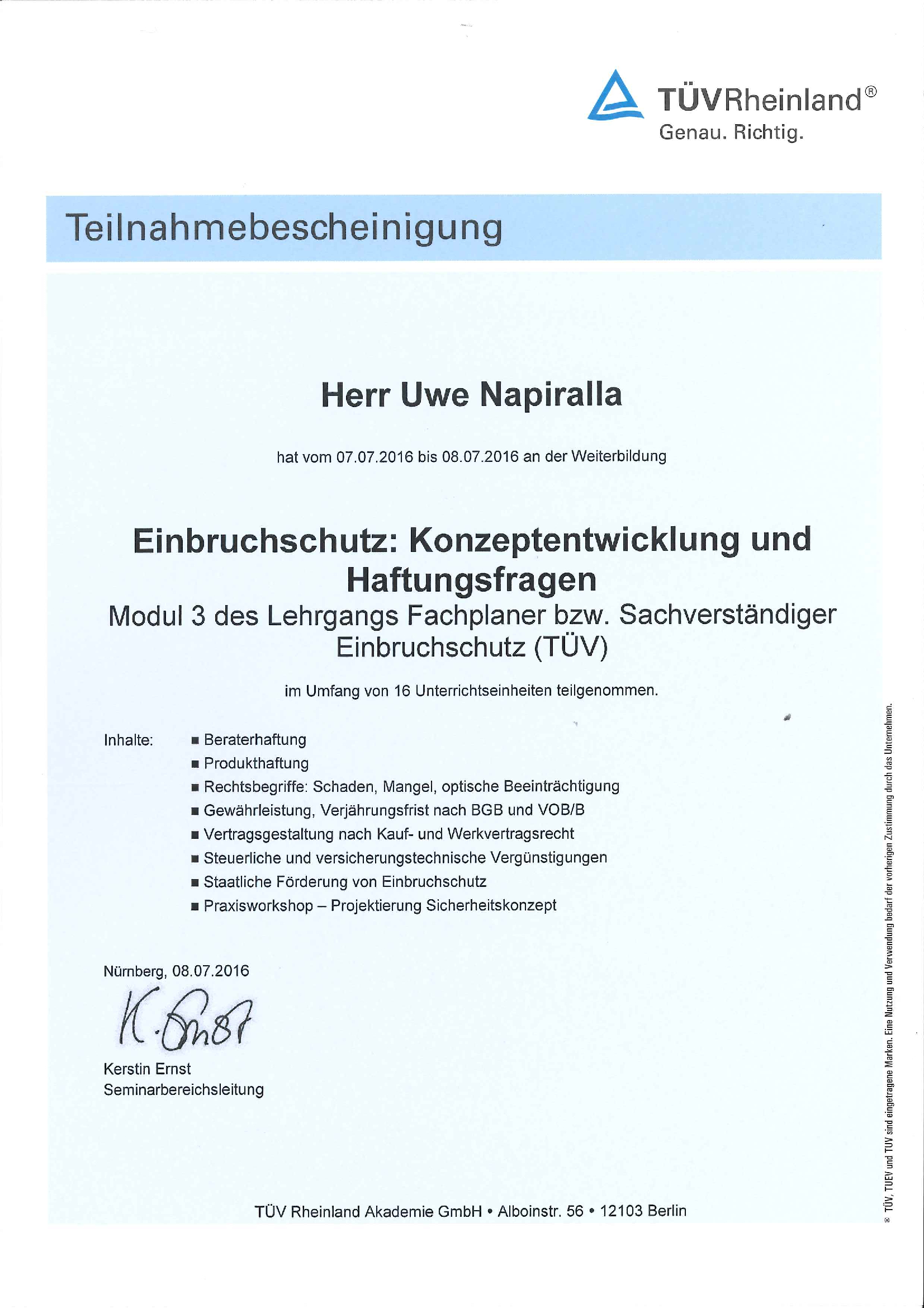 Hr. Uwe Napiralla verfügt seit dem Jahr 2016 über die Zusatzqualifikation "Einbruchschutz: Konzenptentwicklung und Haftungsfragen"
