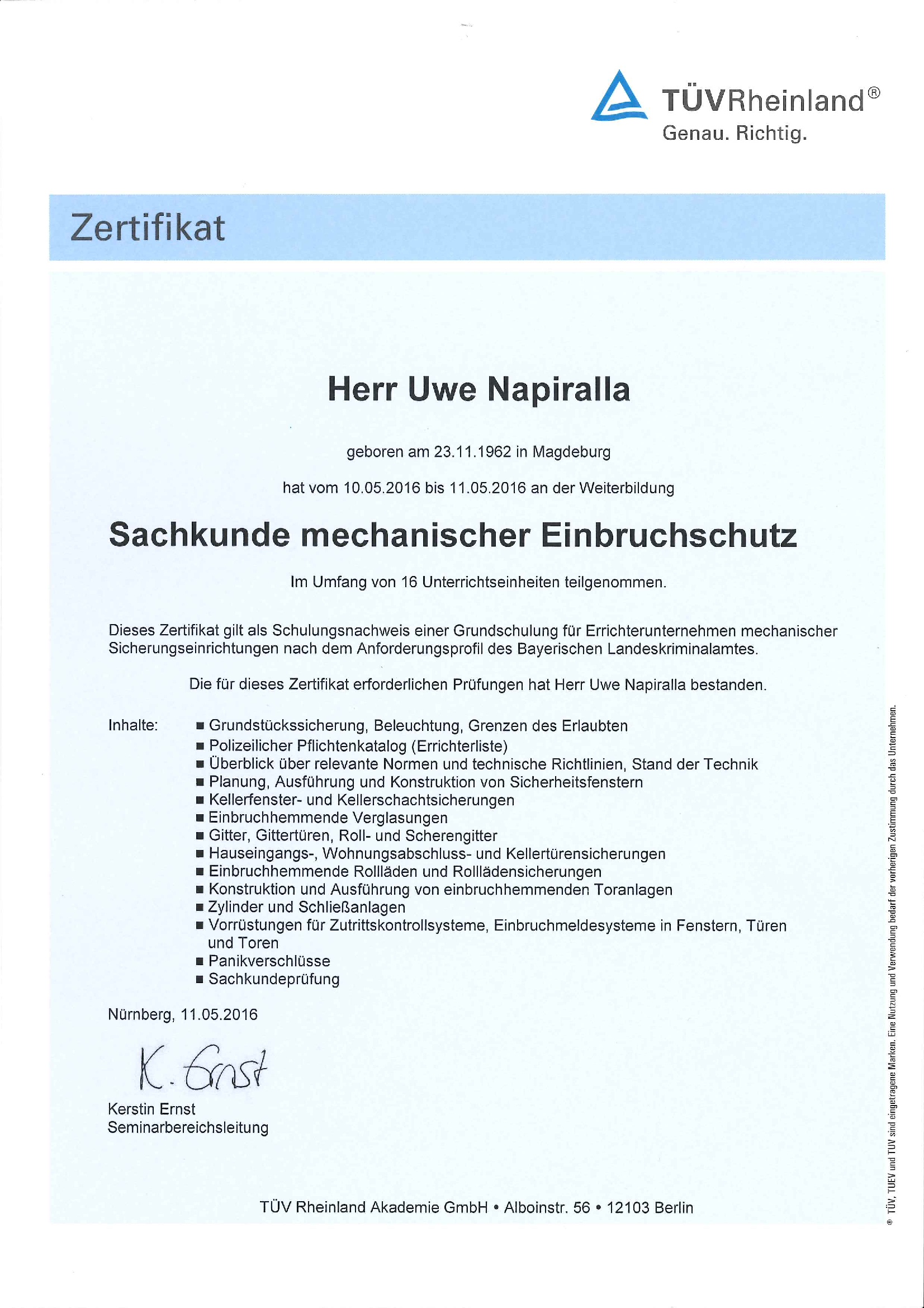 Hr. Uwe Napiralla verfügt seit dem Jahr 2016 über die Zusatzqualifikation "Sachkunde mechanischer Einbruchschutz"